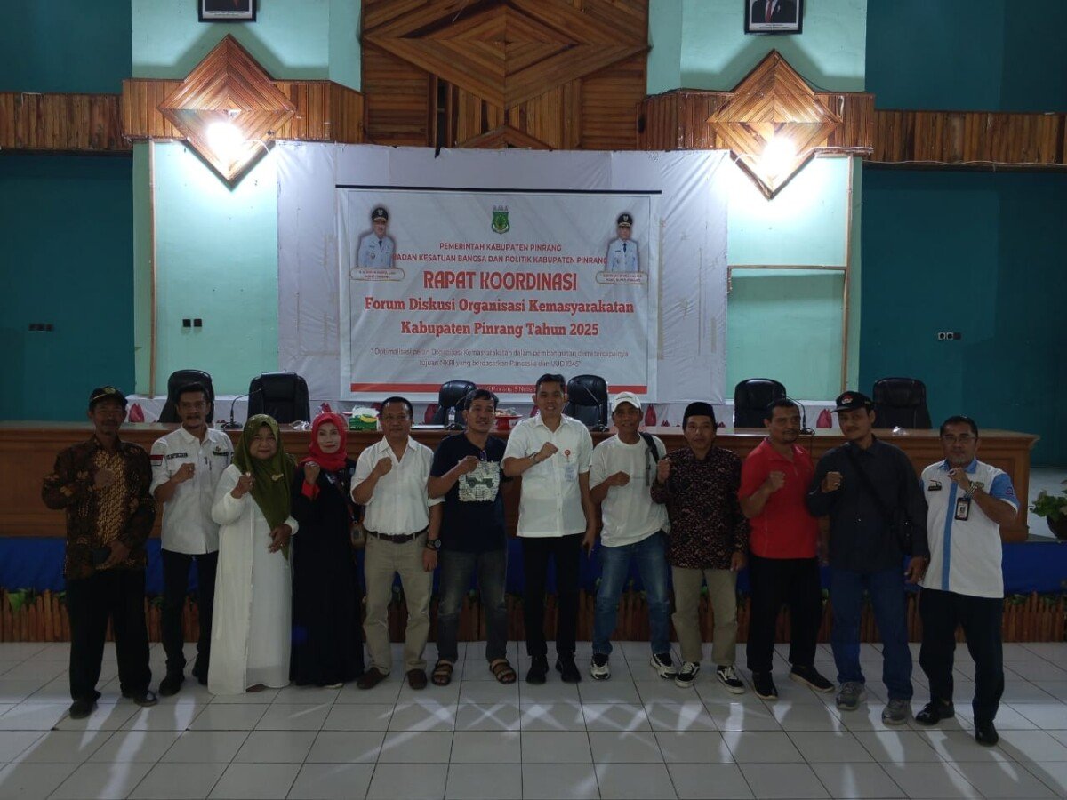 Kegiatan rapat koordinasi ini diikuti oleh berbagai organisasi kemasyarakatan, tokoh masyarakat, dan unsur pemerintah daerah. Suasana kegiatan berlangsung hangat dan interaktif, diwarnai dengan diskusi mengenai peran ormas dalam menjaga stabilitas sosial serta mendukung visi pembangunan Kabupaten Pinrang.