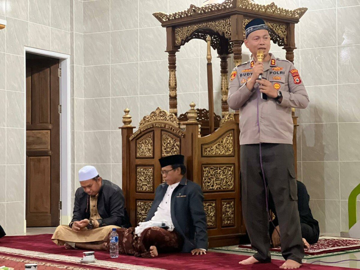 Dalam sambutannya, AKBP Budi Hermawan mengajak jamaah untuk bersama-sama menjaga keamanan dan ketertiban lingkungan. Ia menekankan bahwa stabilitas kamtibmas tidak dapat terwujud tanpa peran aktif masyarakat. Kapolres juga mengaitkan momentum peringatan Isra Mi’raj Nabi Muhammad SAW sebagai peristiwa penting diterimanya perintah shalat, yang menjadi fondasi pembentukan akhlak dan kedisiplinan umat Islam.