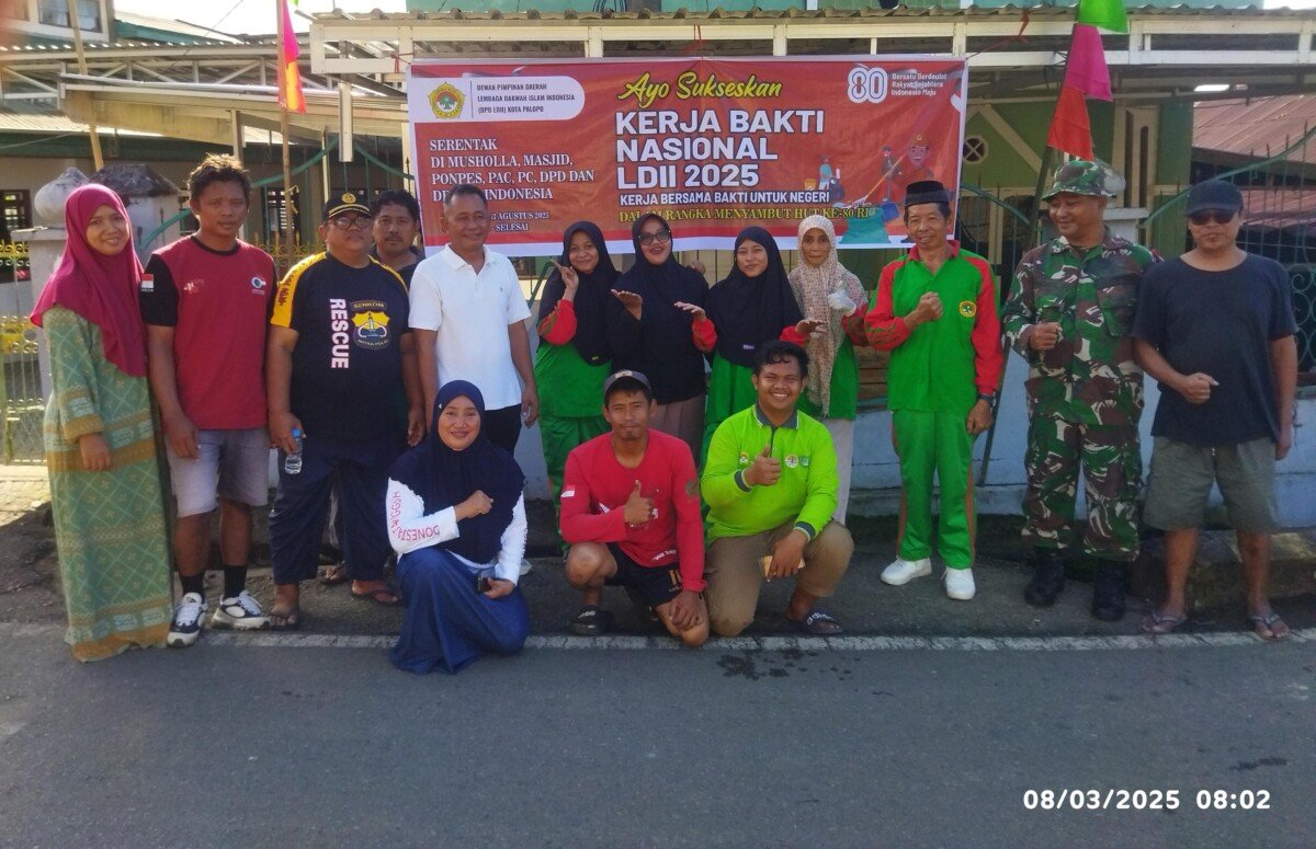 Palopo – Dalam rangka menyambut HUT ke-80 Kemerdekaan Republik Indonesia, warga Lembaga Dakwah Islam Indonesia (LDII) Kota Palopo bersama masyarakat sekitar melaksanakan kegiatan kerja bakti massal yang dipusatkan di Jalan Y Tando, Kecamatan Wara Utara, Kota Palopo, Sulawesi Selatan, Minggu pagi (3/8/2025).